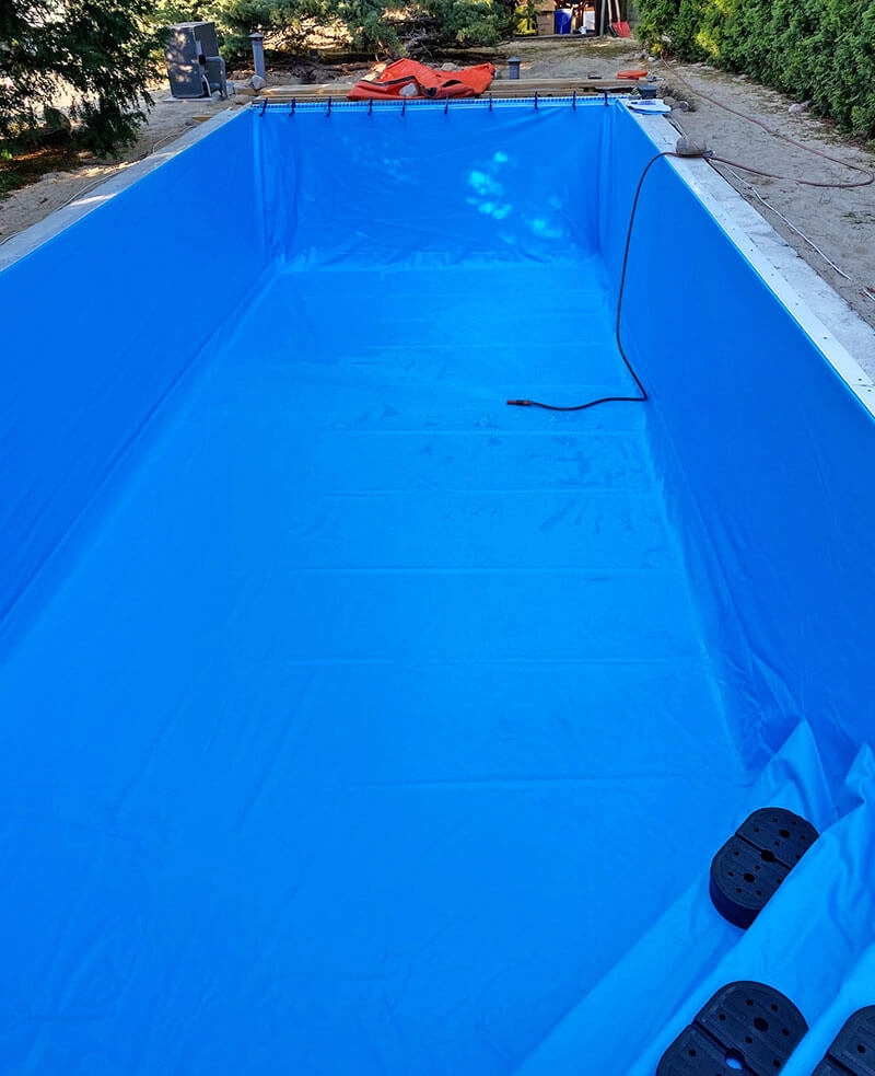 Nous n'avions aucune espérience dans la construction de piscine. Placer les blocs de polystyrène fut rapide. Installer le liner était également plus facile que prévu à deux personnes.