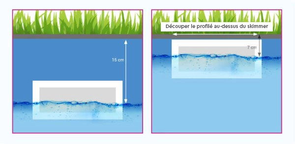 - Skimmer miroir : placé sous la margelle (moins de 7cm du niveau d’eau) pour un niveau d’eau de 1,43m environ. Ce skimmer « effet miroir » est disponible uniquement avec le kit de base pour piscine en polystyrène.