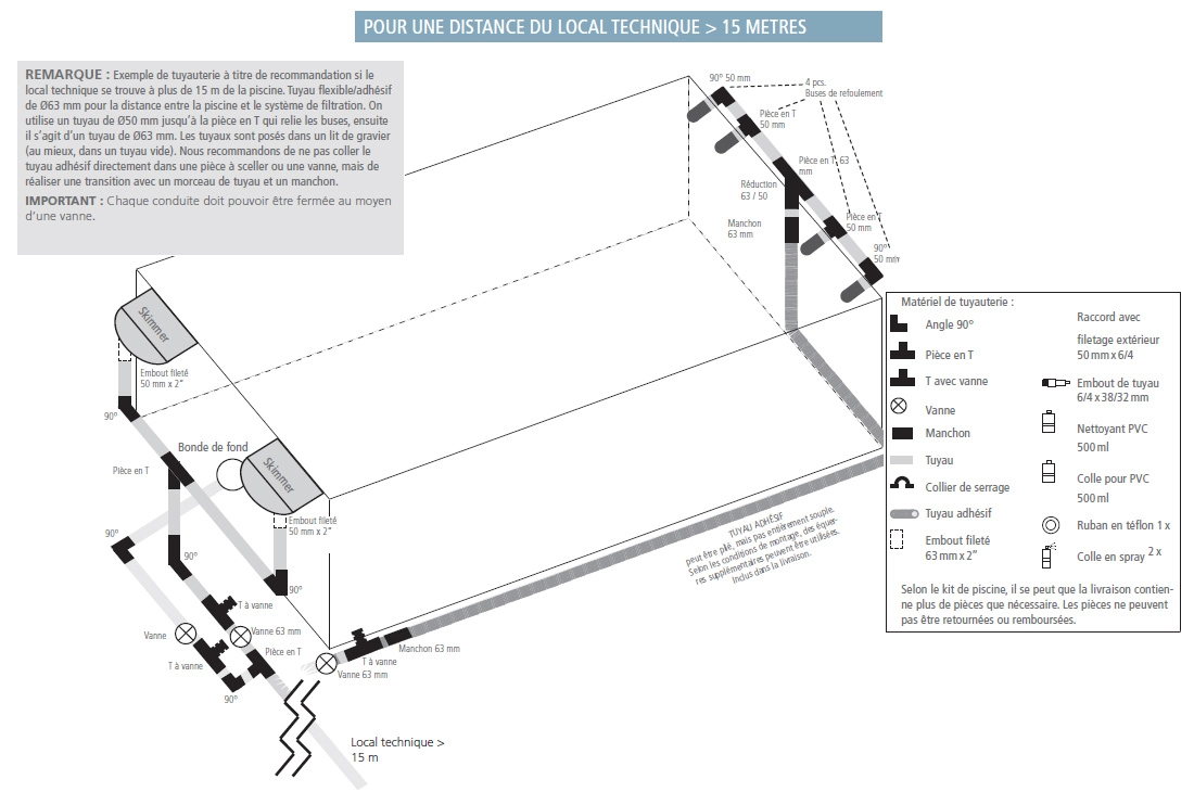 Notre kit de tuyauterie standard, d'un diamètre de 50 mm, convient à ce type de situation car la pompe est à proximité des pièces à sceller. Vous pouvez consulter la notice de montage de la piscine pour connaître nos recommandations en matière de tuyauterie en fonction des dimensions de la piscine. Vous pouvez également nous contacter par email ou téléphone à tout moment pour obtenir des conseils.