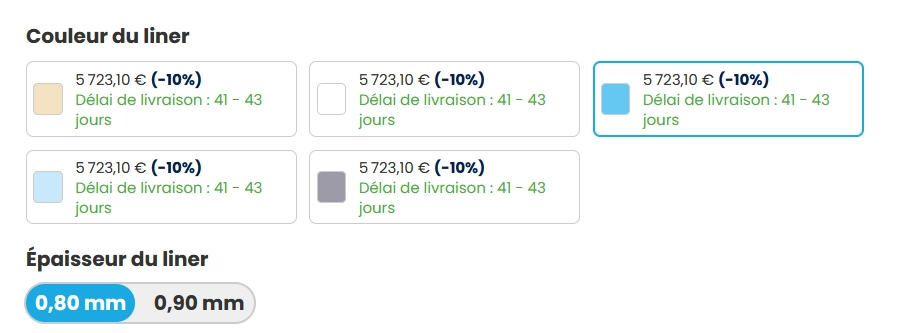 Une fois la configuration et la taille de votre piscine sélectionnées, vous pouvez choisir la couleur et l'épaisseur du liner directement dans la fiche article :