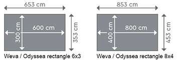 Exemple : La dimension d'une couverture pour Weva 6x3 sera de 600x300 cm.
