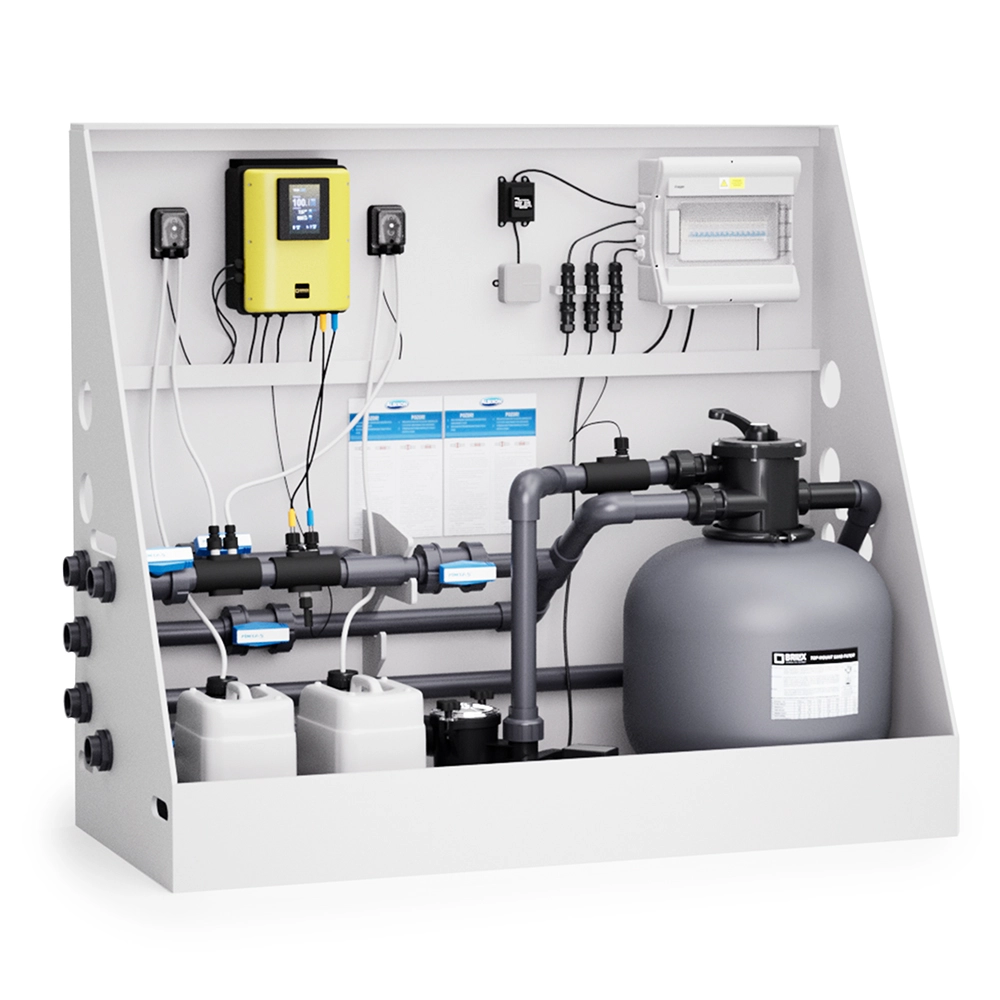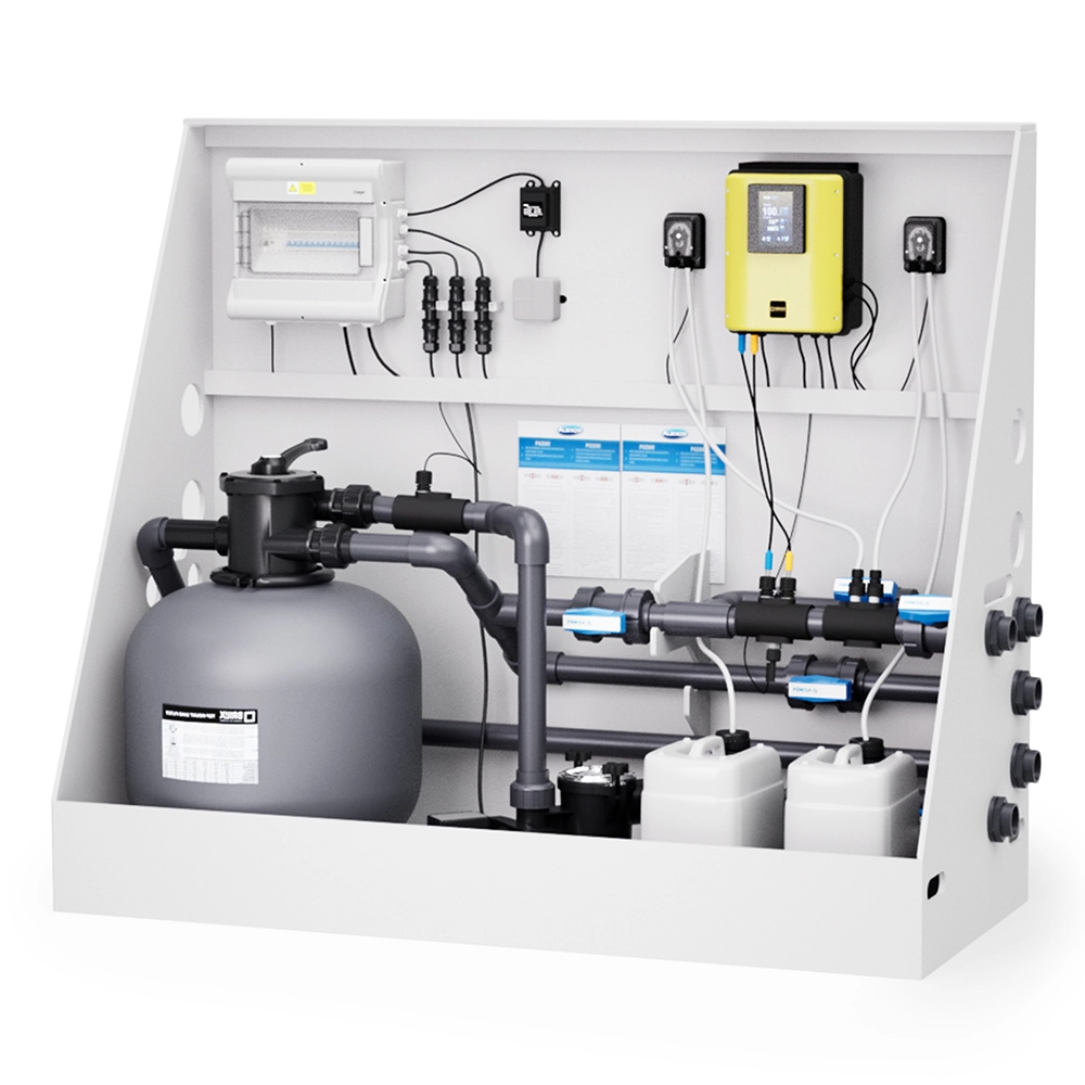 Le kit prémonté constitue une solution pratique et peu encombrante pour placer votre équipement technique de piscine en toute sécurité et de manière facilement accessible. Il est idéal pour une installation dans un garage ou un abri de jardin à proximité de la piscine. Toutes les technologies de la piscine sont protégées et facilement accessibles en cas de besoin.